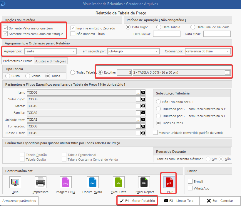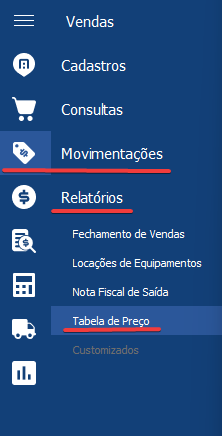 Menu Vendas -> Relatórios -> Tabela de Preço